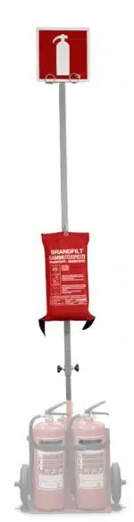 Solid vogn med transporthåndtag og plads til 2 slukkere. Medfølgende stander (2+ meter høj) og ildslukkerskilt sikrer tydelig synlighed og korrekt skiltning – også på midlertidige arbejdspladser. - 2 x Pulverslukker 6 kg (55A – 233B – C)